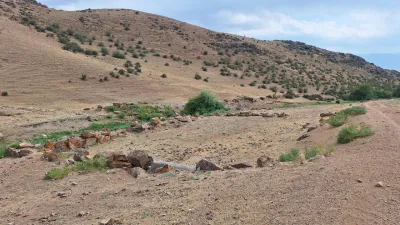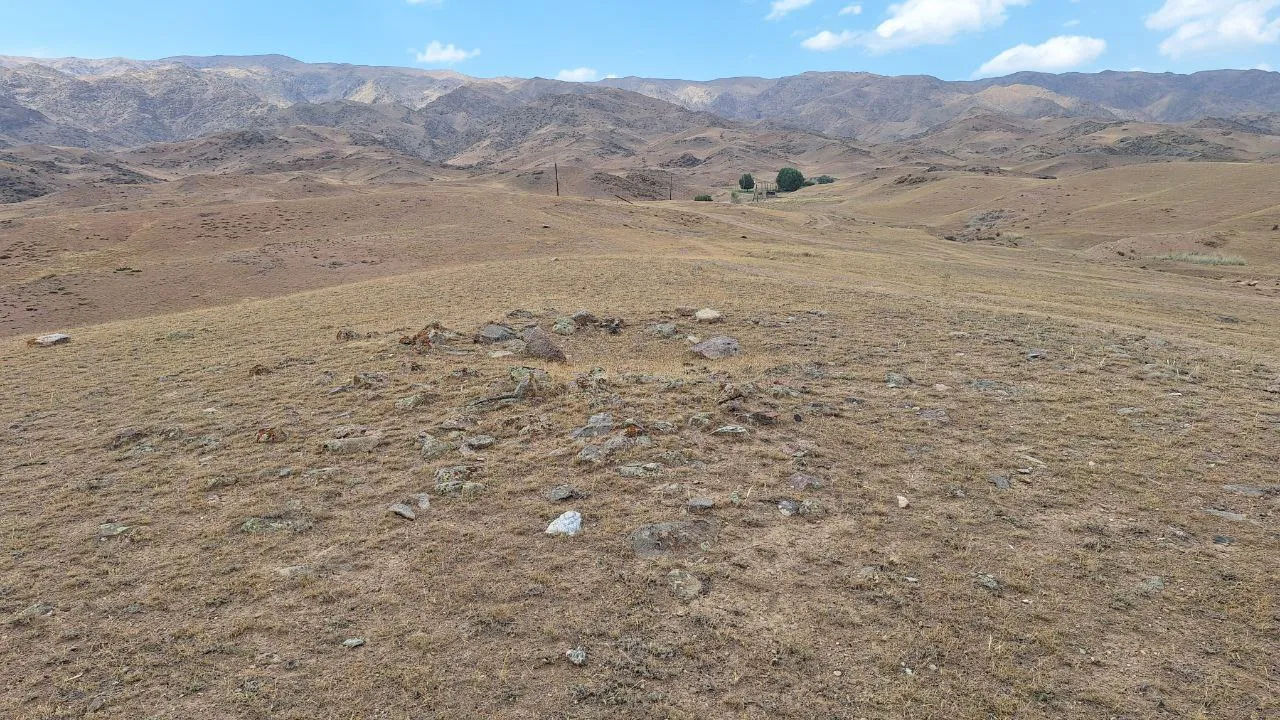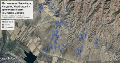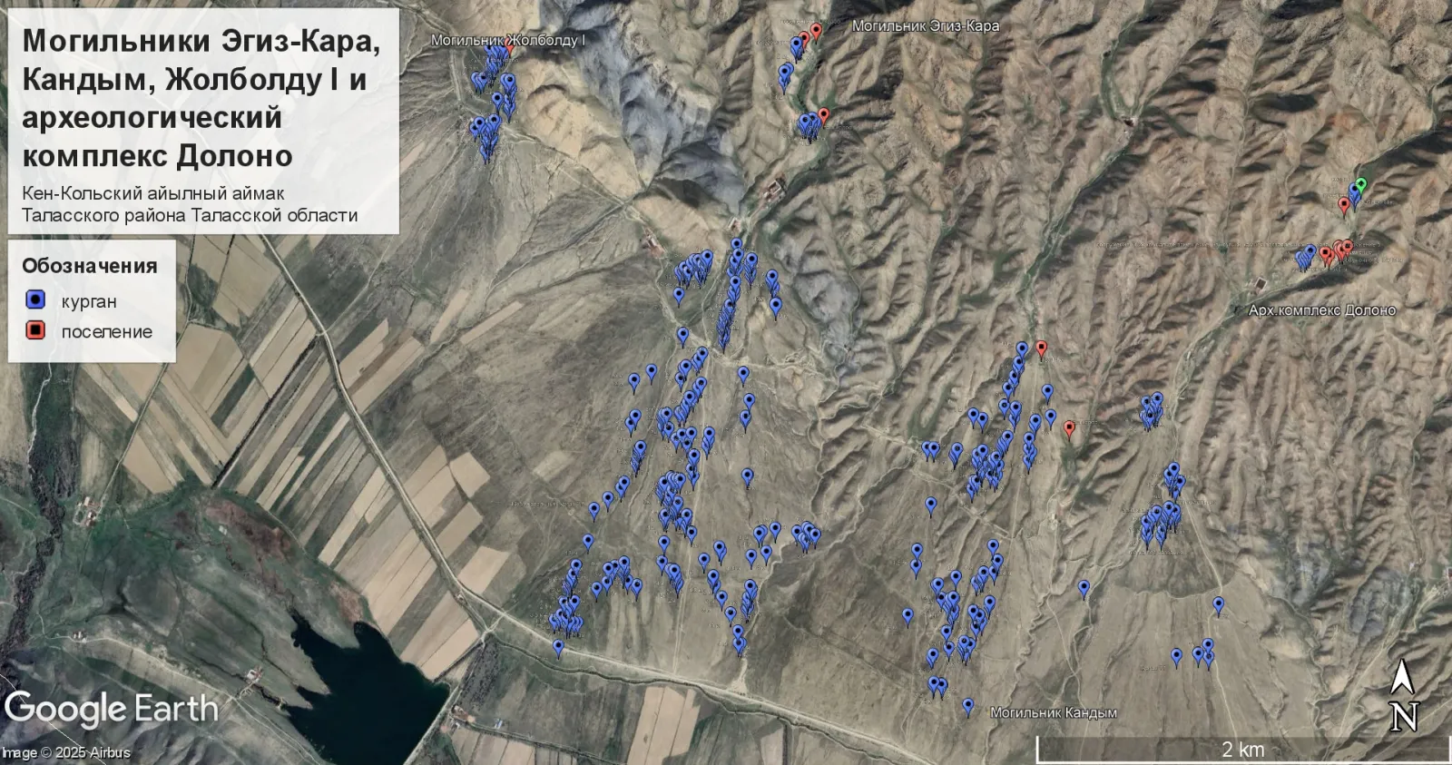 | Кошумча маалымат | Долоно археологиялык комплекси ар кыл доорлорго таандык кургандардан, конуштардан жана петроглифтен турат. Комплекстин бүткүл аймагына чачырап жайгашкан болжол менен 55 курган катталган. Алардын көпчүлүгү түндүк–түштүк багыты боюнча созулган чынжыр сымал тизилмелерди түзөт. Кургандардын үймөлөрү негизинен таш-топурактан туруп, планда көбүнчө тегерекче формада болуп, диаметри 2–25 метрге жетет. Айрым үймөлөрдүн негизинде таш шакек байкалат. |