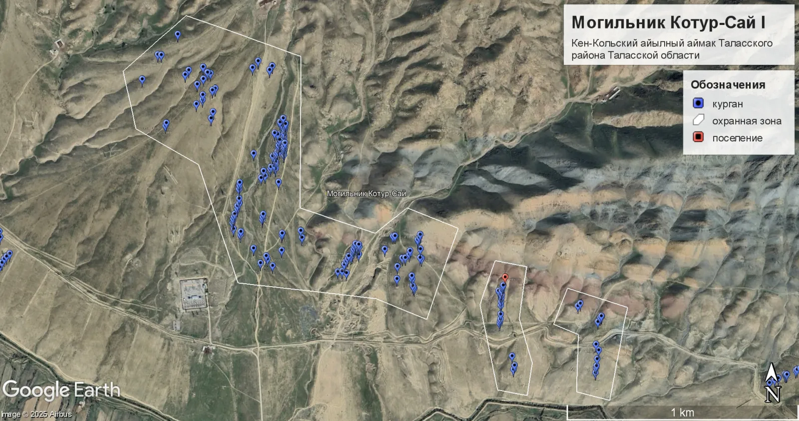 | Кошумча маалымат | Котур-Сай I көрүстөнү болжол менен 165 кургандан турат. Планиграфиялык жактан алганда, ал көптөгөн топторго бөлүнөт, алардын басымдуу бөлүгү меридионалдык багытта жайгашкан чынжыр сымал тизилмелерди түзөт. Калган учурларда кургандар белгилүү бир система жок жайгашканы менен, бири-бирине жакын, компакттуу орун алган. Курган насыктары негизинен таш-топурактан туруп, планда тегерек формага ээ, диаметри 1 метрден 17 метрге чейин жетет. Айрым кургандардын негизинде бир катарлуу таш шакеги байкалат. |