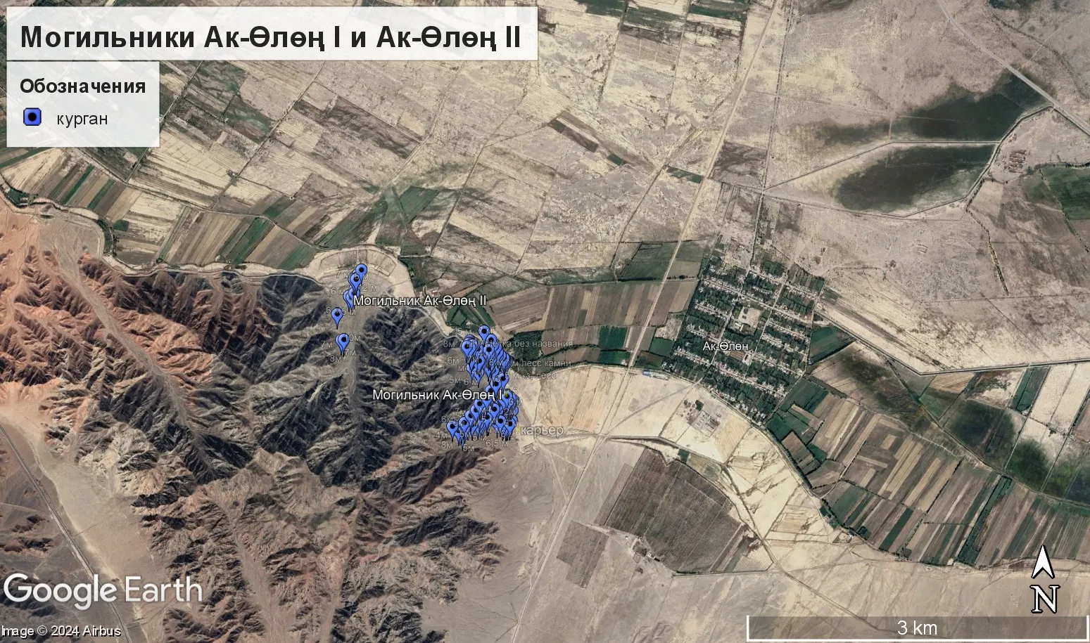 | Кошумча маалымат | Ак-Өлөң II көрүстөнү 19 таш жана таш топурак дөбөлөрдөн турат. Көрүстөндөгү дөбөлөрдү жайгаштыруу боюнча так система жок. 440 м аралыкта түндүк-түштүк ,багытын бойлой созулган 4 топ компакттуу жайгашкан көрүстөндөр бар. Бул топтогу эки коргон тик бурчтуу формада болот. Калгандары план боюнча тегерек. Көрүстөндүн планграфиялык өзгөчөлүктөрүнө, жээктин формасына жана мүнөзүнө таянып, дөбөлөр темир доорунун алгачкы мезгилине таандык. |
