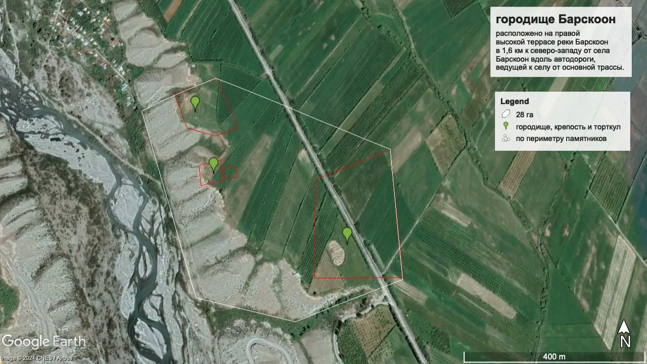 | Аймактын чек аралары жана коргоо зоналары | Барскоон шаарынын алдын ала коопсуздук зонасы 28 гектар аянтты ээлеп, эстеликтердин периметри боюнча аймакты камтыйт. Барскоон конушу, чеби жана төрткүл бир комплекске бириктирилген. |