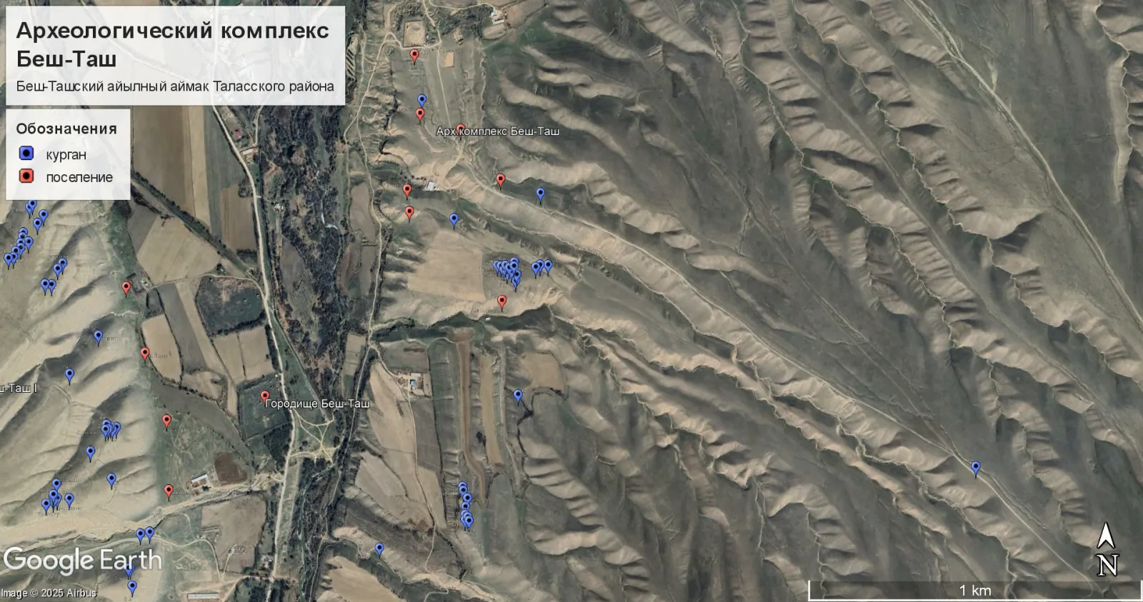 | Кошумча маалымат | Беш-Таш археологиялык комплекси ар кыл коргондордон жана калктуу конуштардан турат. Олуттуу аймакка жайылган 28 Дөбө катталды. Алардын жайгашкан жеринде жалпы жана так система жок. Дөбөлөрдүн эки тобу айырмаланып турат, алардын бири меридионалдык багыттагы чынжыр. Башка учурларда, жалгыз дөбөлөр Олуттуу аймакка чачыранды. Дөбө дөбөсү таш-топурак жана топурак, план боюнча тегерек формалары, диаметри 3 мден 13 мге чейин. меридион чынжырына тизилген дөбөлөр темир дооруна таандык. Калган дөбөлөр эрте темир дооруна жана/же орто кылымдардагы доорго таандык. |